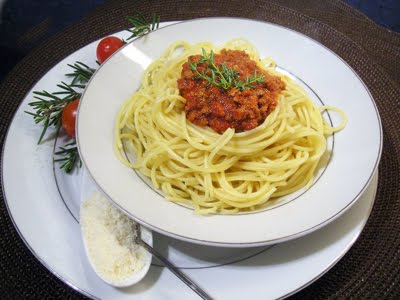 Il apporta d'abord les Tomates mozzarella, puis les Spaghettis à la Bolognaise